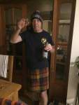 Haggis? Eaten it and got the t-shirt. Well, in the photo, that is actually a tea-towel I’m wearing. There is a saying that when you first come across haggis you are not sure if you have to kick it or eat it. After you have eaten it, you wish you had kicked it! That was absolutely true for me. We went to a hotel in Edinburgh for a taste of traditional Scotland not long after we moved there. You know the score – pipers and drums, the haggis and neeps, a fair amount of whisky. Well, the next day my tummy was trying hard to get back to England. I will spare you the details. I was working in a hospital just outside the city and had to travel by bus. For obvious reasons, I had to break my journey. I felt dreadful and in the end I had to leave work early. I can assure you it was the haggis and not the alcohol. The good news is that I persevered and actually got to like haggis. Not parsnips though, never my thing. The photo shows me at home after having addressed the haggis in the traditional way and deftly cut it open with a paring knife I had craftily tucked into my sock.