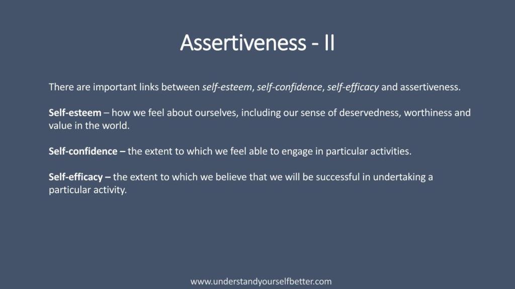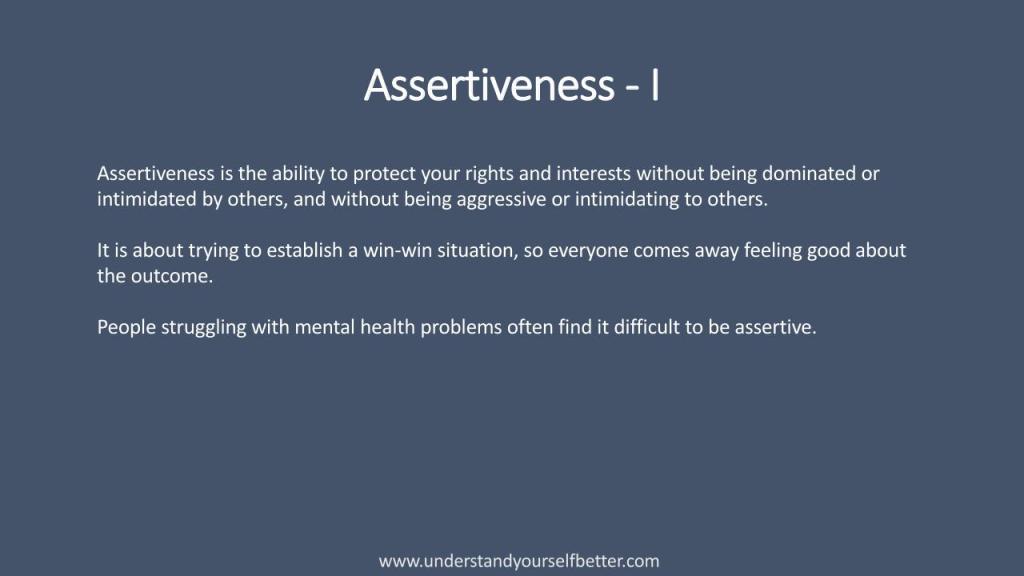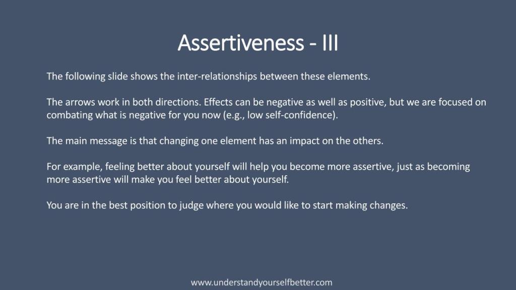 These slides form the basis of the workshop on Assertiveness. As is the nature of psycho-educational groups, the magic occurs between the slides thanks to the unique contributions of the participants. This session lends itself to role play opportunities – for example, modelling assertive, submissive, and aggressive approaches to returning an item to a shop. The slides are downloadable in PDF format.