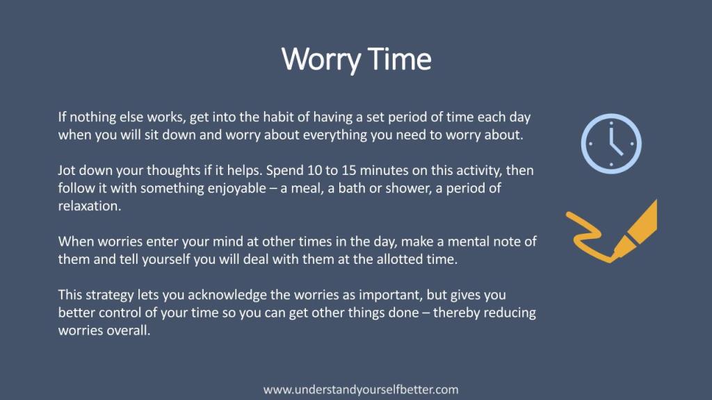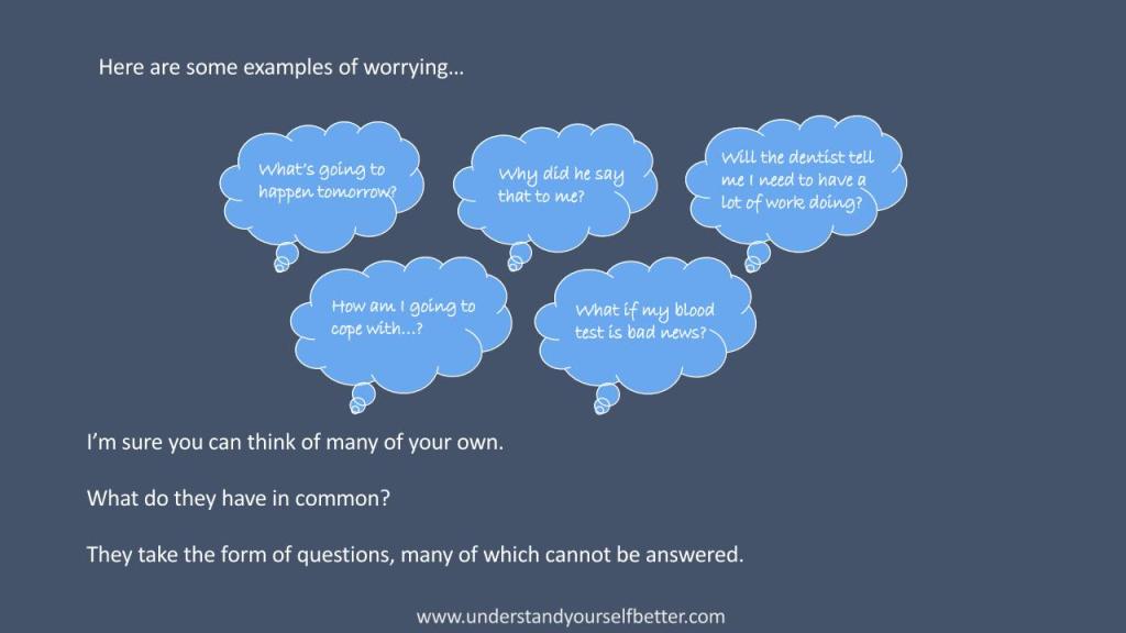 These slides form the basis of the workshop on Worrying. As is the nature of psycho-educational groups, the magic occurs between the slides thanks to unique and ever-changing contributions of the participants. The slides are downloadable in PDF format.